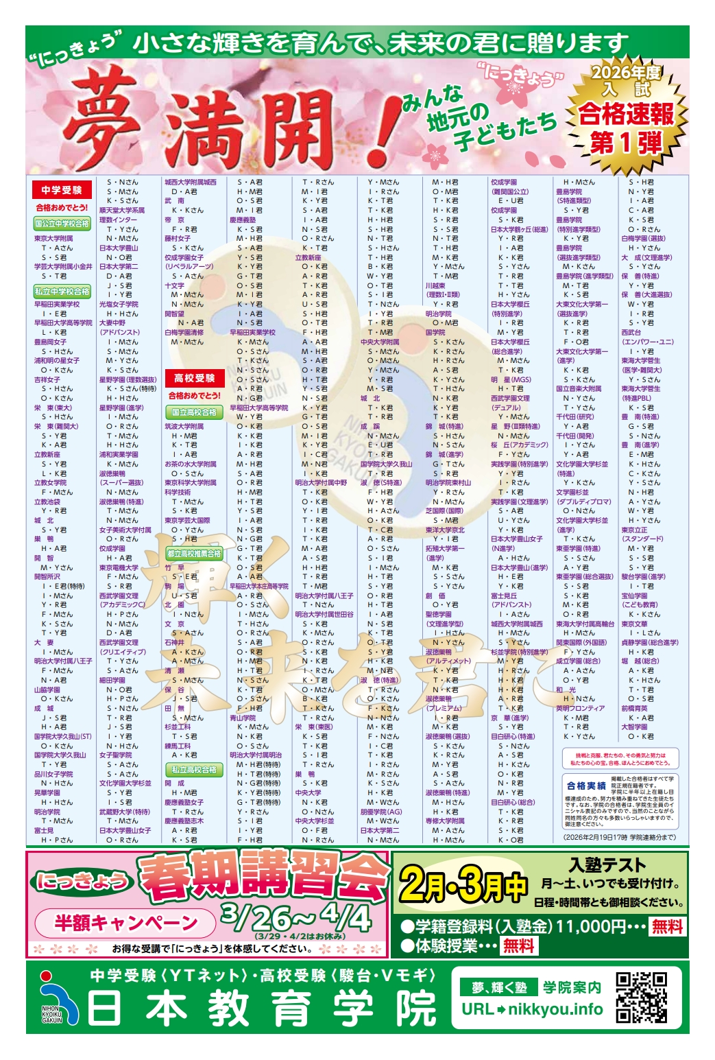 2026.02.20🌸 2026年度 入試 合格速報 🌸 第1弾 Post Share Hatena Pocket RSS feedly Pin it 記事のタイトルとURLをコピーする本年度入試において、日本教育学院の生徒たちから続々と合格のお知らせが届いています!一人ひとりが積み重ねてきた努力の成果です。本当におめでとうございます。※掲載している合格者は、すべて当学院の正規在籍生です。※自分のイニシャルが見つからない生徒は各校舎の先生までお知らせください。2026年2月19日17時までの報告です。第2弾は3月上旬にお知らせいたします。 記事のタイトルとURLをコピーする Post Share Hatena Pocket RSS feedly Pin it 【2月7日(土)実施】新年度スタート応援・第1回オープン模試のご案内(新小3~新中3対象)前の記事
